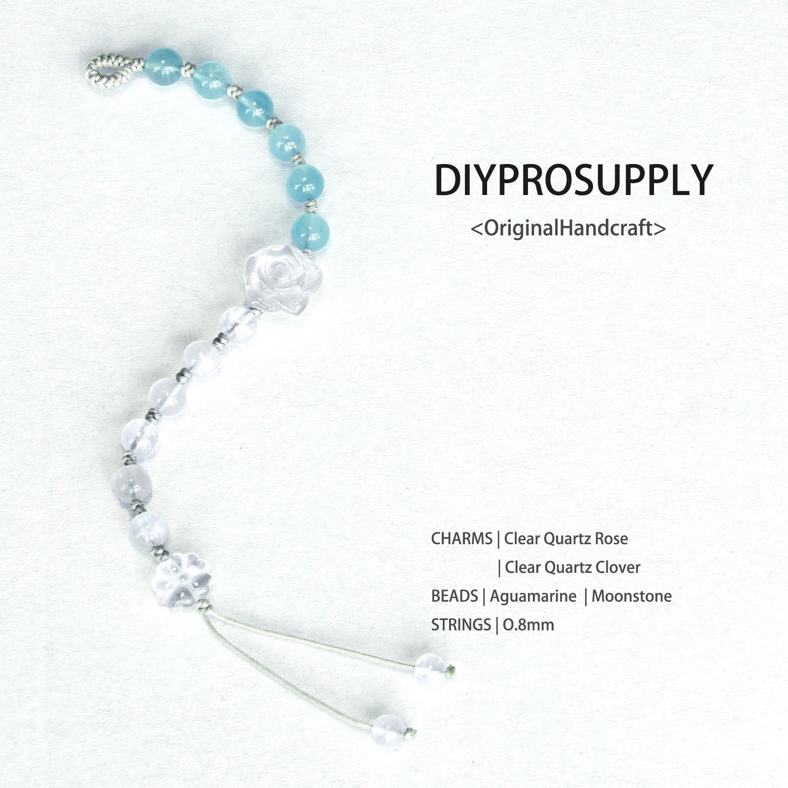 Luminous aquamarine + moonstone beads; 0.8mm cord; clear quartz rose/clover charms