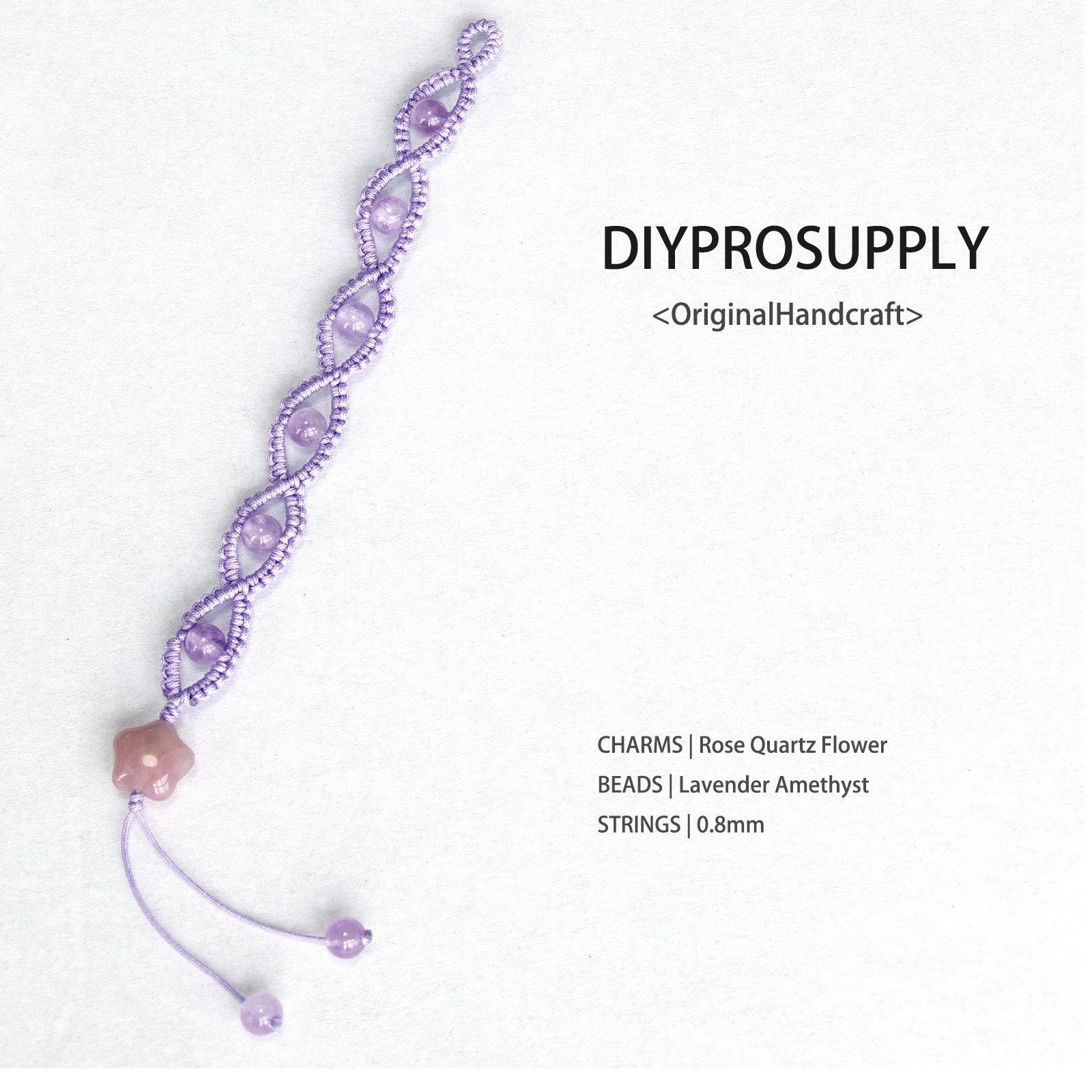 Soft lavender amethyst beads + 0.8mm macramé cord + rose quartz flower charm