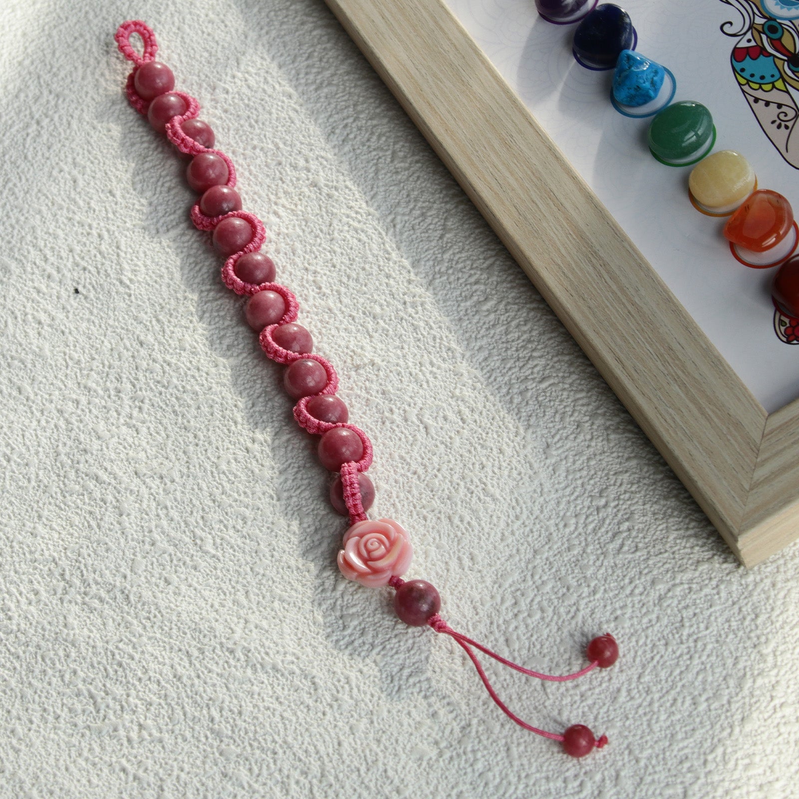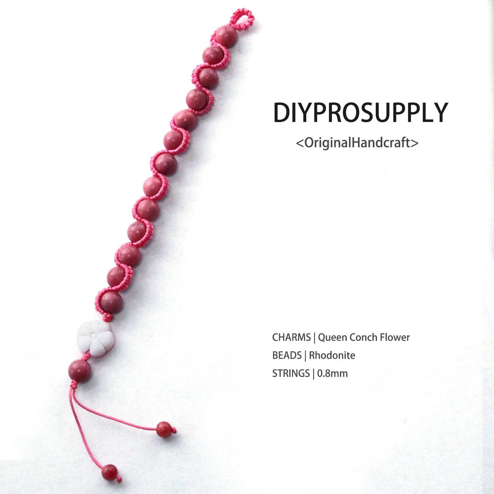 Rich rhodonite beads + 0.8mm pink cord, paired with queen conch flower charm